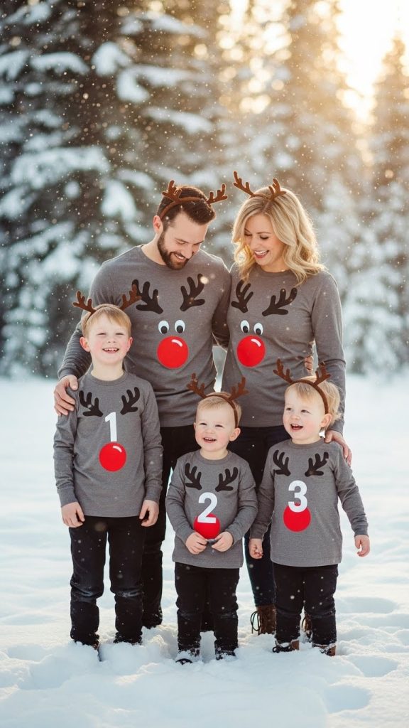 Coordinate shirts where each member represents a reindeer with a numbered “Rudolph” or “Dasher” style motif.