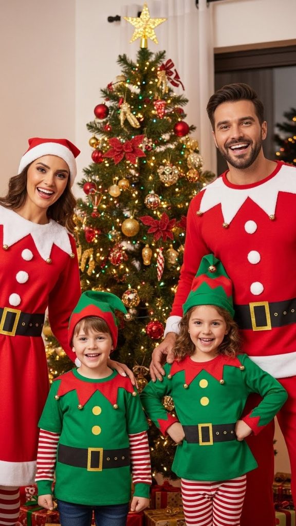 Create a family theme with parents as Santa and children as elves, coordinating colors and designs.