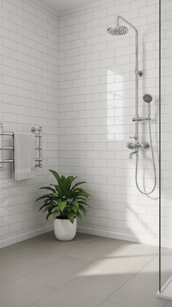 Tip: Consider large-format glossy white tiles to reduce grout lines and make maintenance easier.
