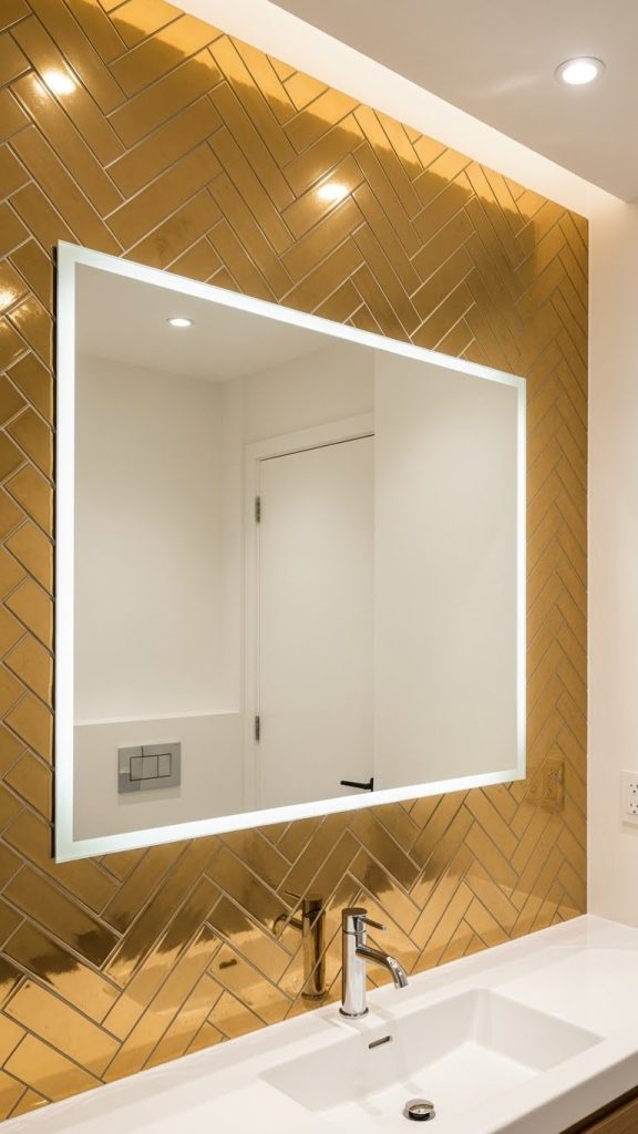 For a touch of glam, metallic glossy tiles are a showstopper. Gold, silver, bronze, or copper-toned tiles catch the light beautifully, creating a luxurious shimmer. They work particularly well as accent tiles in small areas like the backsplash behind the sink or around mirrors. Metallic glossy tiles are perfect for contemporary, art-deco, or even eclectic bathroom designs.