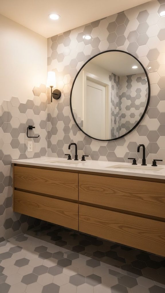 Geometric glossy tiles, whether hexagonal, diamond-shaped, or octagonal, add a contemporary edge to bathrooms. The glossy finish highlights their unique shapes, making them pop against neutral walls or floors. These tiles are perfect for modern, minimalist, or Scandinavian-inspired bathrooms.
