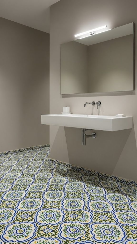 Patterned glossy tiles can turn your bathroom into a work of art. Moroccan, Spanish, or vintage-inspired motifs in glossy finishes add character while reflecting light beautifully. These tiles are ideal for feature walls, floors, or vanity backsplashes, creating a statement without being overpowering.