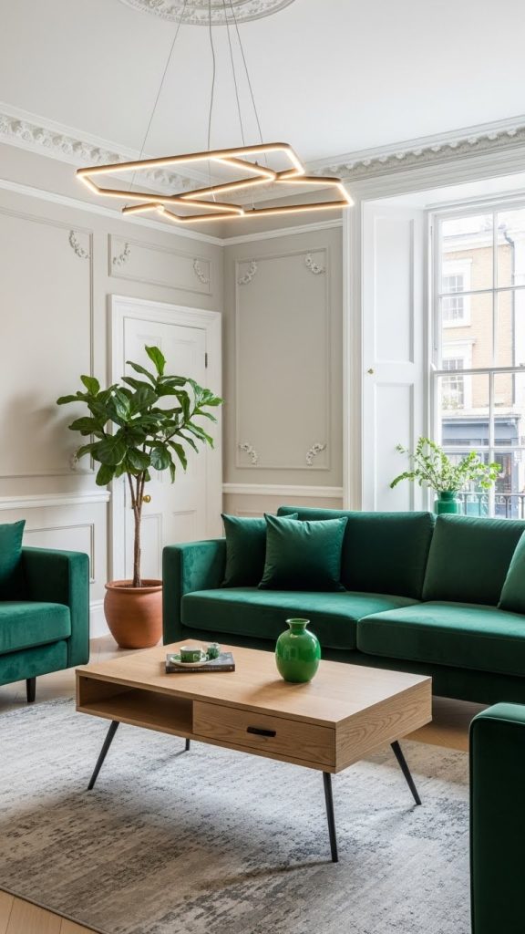 For those who love a blend of old and new, adding green accents to a modern interpretation of a Georgian living room can be striking. Think sleek green sofas, minimalist coffee tables, and contemporary lighting juxtaposed against classic Georgian mouldings and high ceilings. This fusion maintains the elegance of Georgian architecture while injecting a fresh, contemporary feel. Green accessories, such as plants, vases, and art, can bridge the gap between modernity and tradition.
