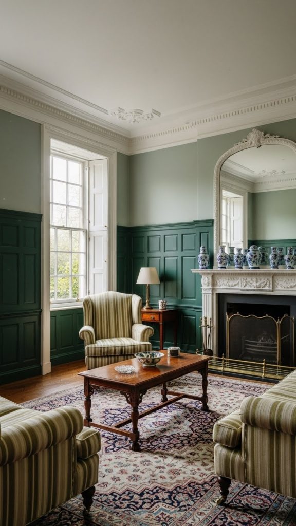 A hallmark of Georgian interiors is the use of wall paneling. Experiment with two-tone green walls by painting the upper panels in a lighter green shade and the lower panels in a deeper green. This adds visual interest and emphasizes the architectural features. White or cream mouldings between the panels can provide contrast and maintain a classic Georgian feel. Complete the look with a dark wood coffee table and vintage accessories for an authentic atmosphere.