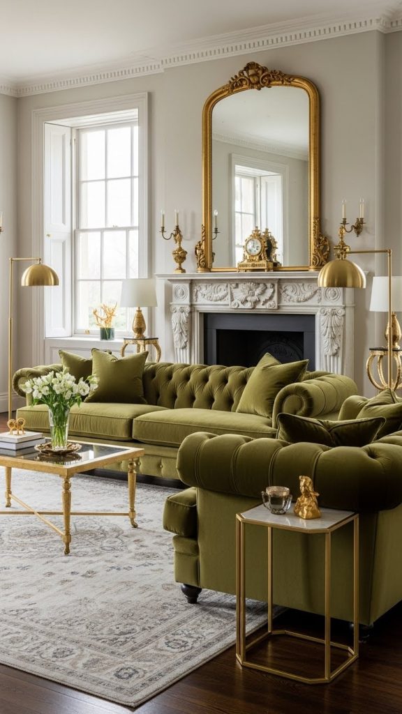 Instead of painting the walls, consider introducing green through statement furniture pieces. A rich olive green sofa or a pair of velvet armchairs can be the focal point of the room. Pair with neutral walls and elegant Georgian features, such as a marble fireplace or decorative cornices, to keep the look balanced. Accent cushions in varying shades of green, or a patterned rug, can tie the furniture into the room seamlessly.