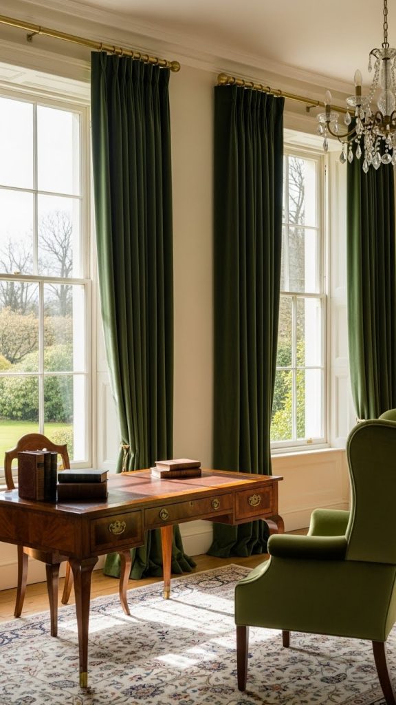 Tall Georgian windows provide a stunning opportunity to incorporate luxurious green velvet curtains. Deep green drapes can frame large windows beautifully, adding richness and depth to the space. Choose a heavy velvet that pools elegantly on the floor for a traditional look, or a lighter linen-velvet blend for a more relaxed feel. Pairing the curtains with neutral walls and classic wooden furniture ensures the room remains balanced and elegant.