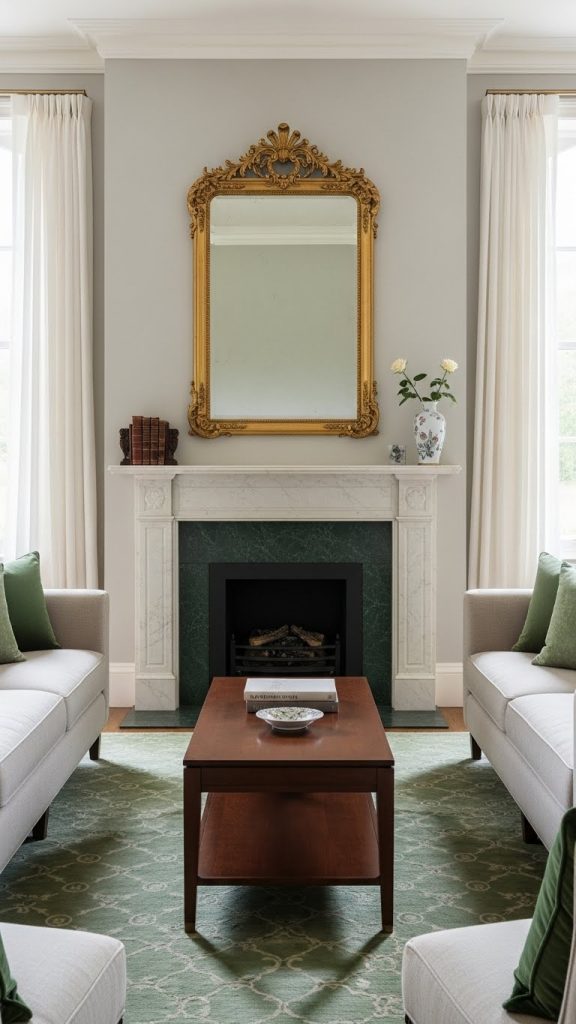 A classic Georgian fireplace is often the centerpiece of the living room. Highlight this feature by using a green-painted surround or incorporating green marble. This approach adds a touch of luxury and draws attention to the architectural detail. Surround the fireplace with neutral furniture and soft green accents to maintain harmony. Adding an ornate mirror above the fireplace can enhance the sense of space and reflect natural light, making the green tones pop.