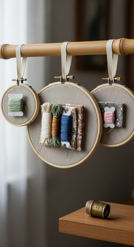 This idea is perfect for crafters. Arrange hoops vertically or horizontally. Add lace trim or paint the hoops gold for elegance.