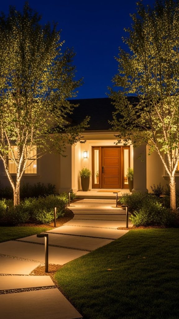 Strategic lighting can highlight your home’s architectural features and improve safety. Install pathway lights along driveways and garden paths, accent lighting for trees or sculptures, and wall-mounted lights near entrances. Warm LED lights create a cozy ambiance, while spotlights can make your home’s exterior features stand out at night. Outdoor lighting not only adds beauty but also provides practical functionality for evening gatherings.