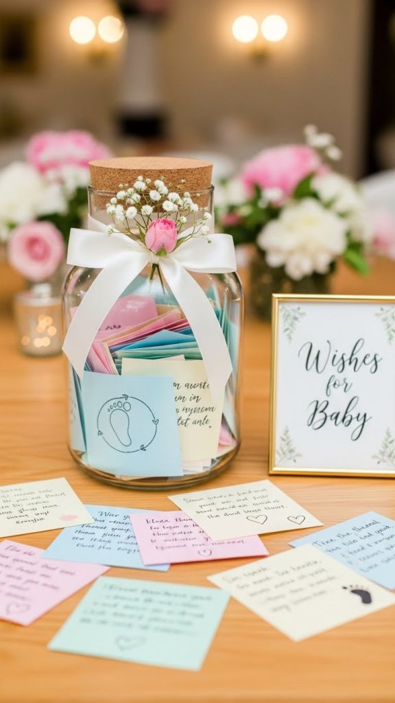 Create a “Wishes for Baby” station where guests can write messages of love, hopes, and dreams for the baby’s future. These notes can be placed in a decorative jar or box. Parents can read them later or even save them for the child to read when they’re older. This activity is emotional, interactive, and creates a timeless keepsake filled with positivity.