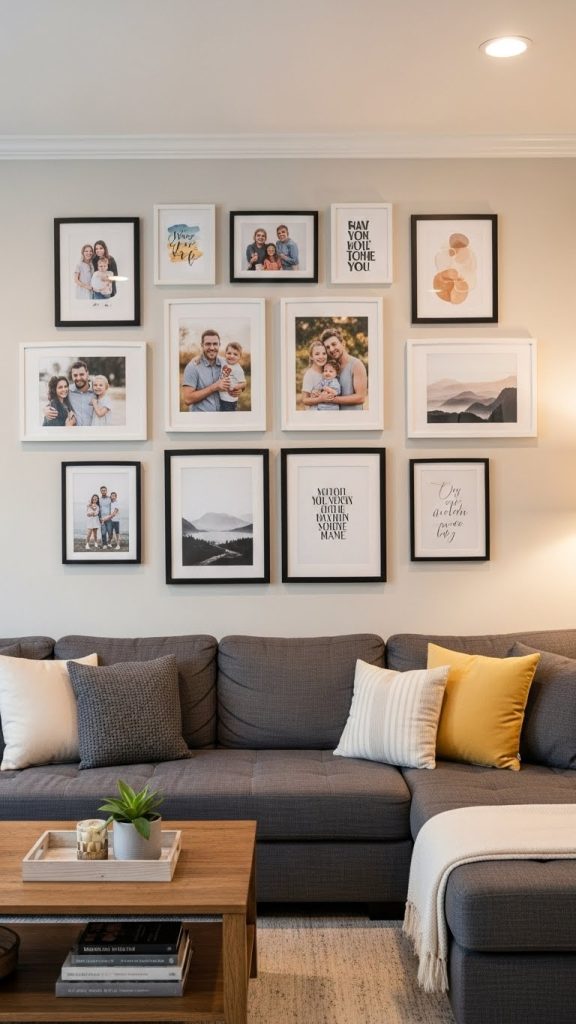 A gallery wall is an excellent way to showcase personal style and cherished memories. Arrange a collection of framed photos, art prints, or even mirrors in a cohesive layout. You can opt for a symmetrical grid for a formal look or an eclectic mix for a more relaxed, bohemian feel.