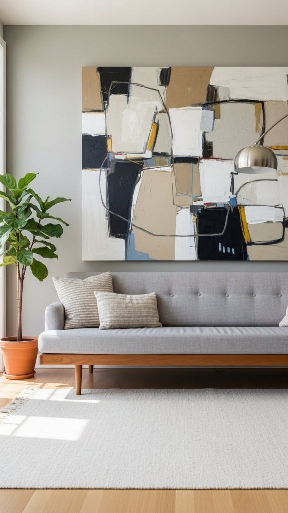 A single, large piece of artwork can have more impact than a collection of smaller items. Choose a bold painting, photograph, or canvas that complements your color scheme and style. Large art works best above the sofa or fireplace, instantly elevating the room’s aesthetic.