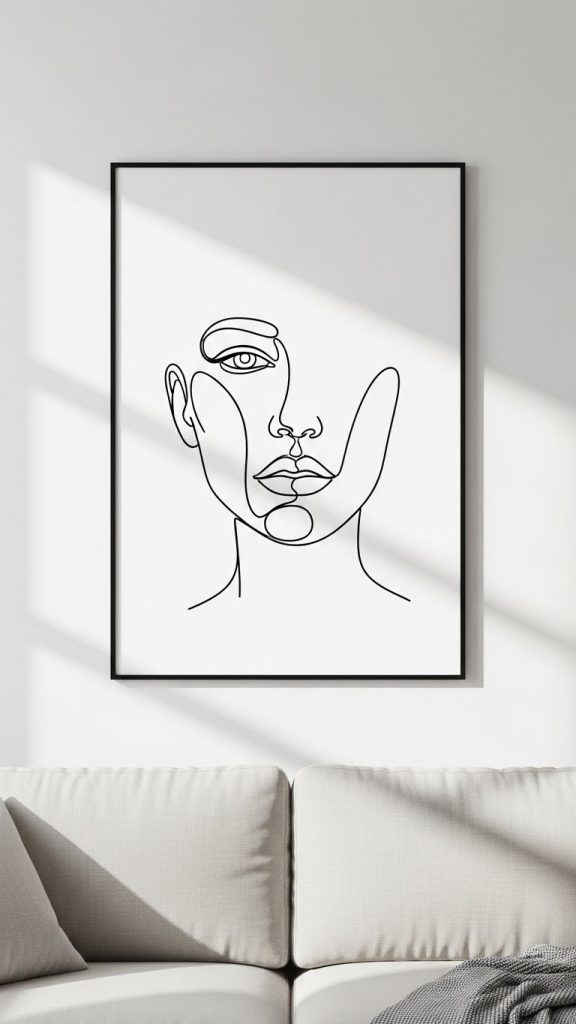 Line art is a staple of minimalist design. Using simple black lines on a white background, these drawings often depict abstract faces, animals, or geometric shapes. Their elegance lies in the lack of color and complexity, making them a perfect fit for modern spaces. Line drawings work well in sets or as a single statement piece above a sofa or bed.