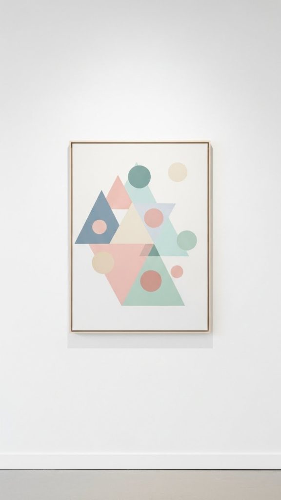 Geometric shapes in neutral or muted tones offer a minimalist yet visually dynamic approach. Triangles, circles, and rectangles arranged in balanced compositions can add structure to your wall without clutter. These pieces often evoke a sense of harmony and order, making them ideal for office spaces or minimalist living rooms.