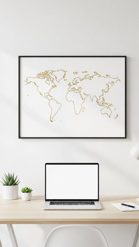 Maps of cities, countries, or the world, rendered in a simple, outline style, are a minimalist favorite. These pieces are both personal and stylish, offering a subtle nod to travel, memories, or your favorite places without cluttering your walls.