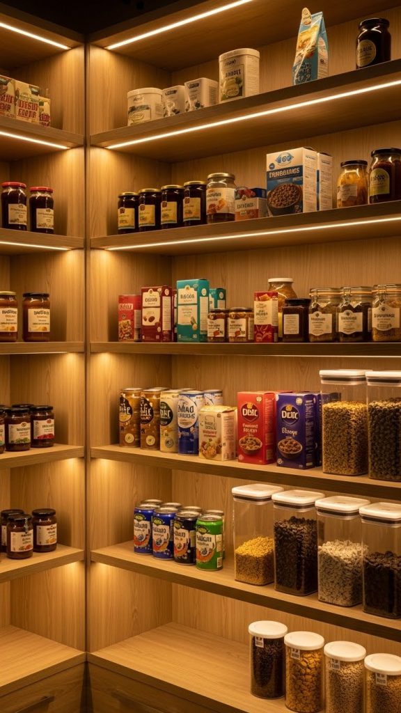 Good lighting is essential for a functional and visually appealing pantry. Dark or poorly lit pantries make it hard to see items and can contribute to clutter. Install LED strip lights, motion-sensor lights, or battery-operated puck lights to brighten every shelf. Warm, energy-efficient lighting enhances the pantry’s aesthetic while ensuring you can quickly find what you need, even in the back corners.
