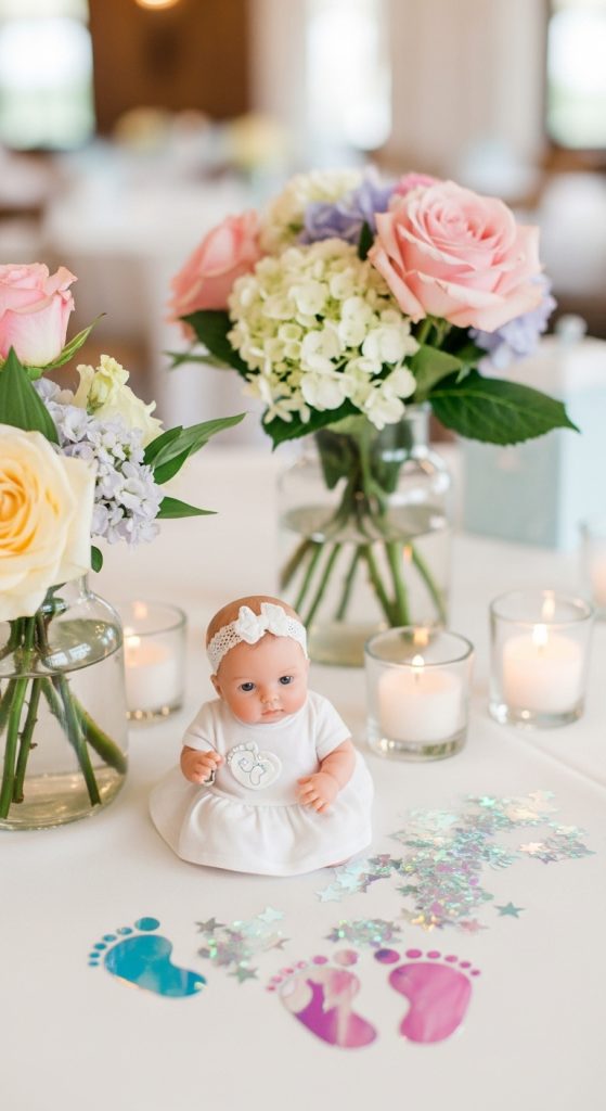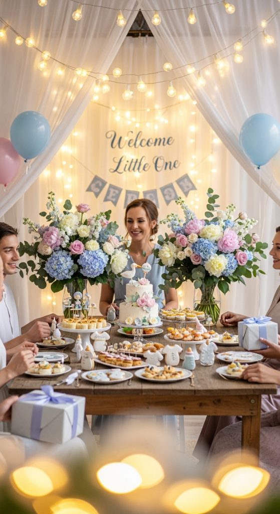 Tables should feel warm and welcoming. Use light-colored tablecloths, gauze runners, or lace overlays for texture. Centerpieces can include small floral arrangements, baby bottles filled with flowers, or cloud-shaped décor pieces. Personalized place cards or small umbrella tags can add a special touch, making guests feel appreciated and included in the celebration.