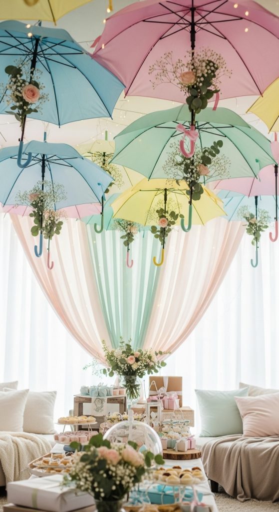 Umbrellas are a beautiful visual symbol for this theme, representing protection, care, and love. Decorative umbrellas can be hung upside down from the ceiling with ribbons, faux flowers, or raindrop cutouts cascading down. Mini umbrellas can also be used as centerpieces or incorporated into the dessert table. These elements reinforce the “showered” concept in a whimsical and charming way that guests will adore.