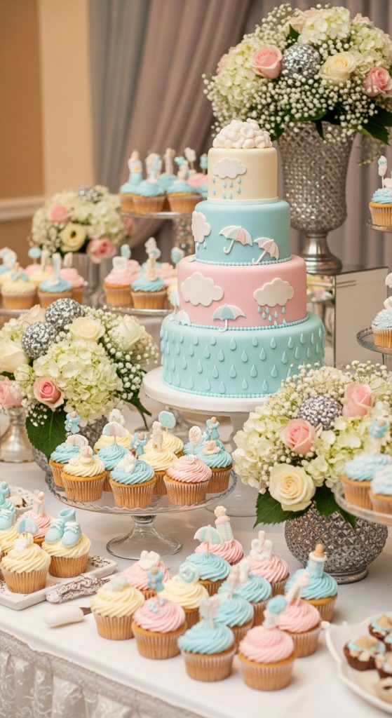 No baby shower is complete without a show-stopping dessert table. For this theme, choose a cake design featuring clouds, raindrops, umbrellas, or delicate script reading “Showered With Love.” Cupcakes, cake pops, macarons, and cookies can follow the same theme with soft colors and minimal detailing. Display everything on tiered stands with floral accents and soft lighting to create a magazine-worthy setup.