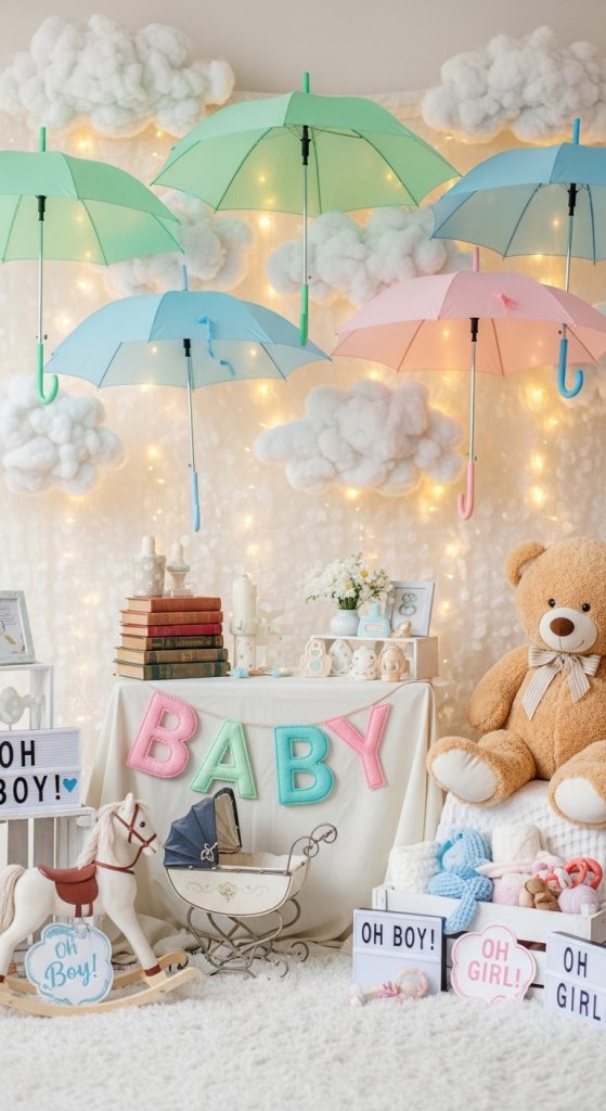 A photo booth allows guests to capture beautiful memories while interacting with the theme. Set up a backdrop featuring clouds, pastel drapes, umbrellas, or soft floral arches. Provide props like baby onesies, “mom-to-be” signs, umbrella cutouts, and heart-shaped accessories. This not only enhances the décor but also gives guests a fun activity they’ll remember long after the event.