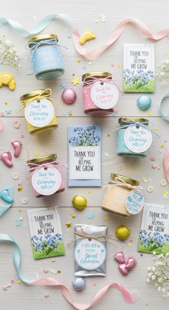 Send guests home with small tokens of appreciation that reflect the theme. Ideas include scented candles, mini soaps, seed packets labeled “Watch Love Grow,” or chocolates wrapped in pastel packaging. Adding a thank-you note or a tag with the baby’s name (if revealed) makes the favors feel more personal and heartfelt.