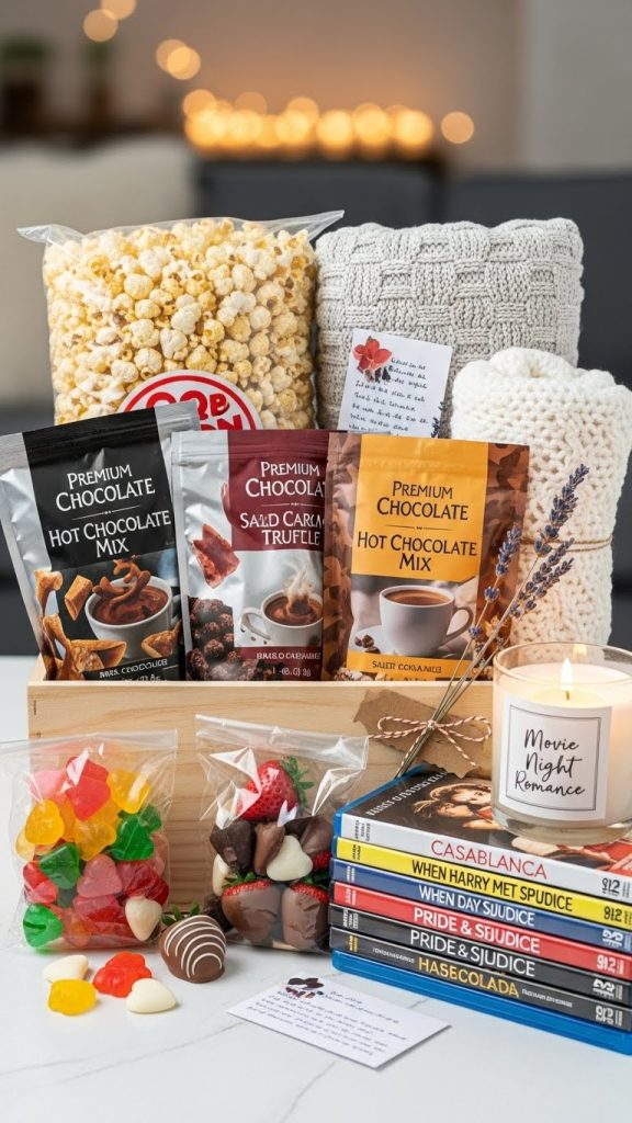 A romantic movie night box is a fun and cozy gift idea. Include a selection of classic romantic films or a gift card for a streaming service, along with popcorn, candy, and hot chocolate packets. You can add a soft blanket, cozy socks, or even a small decorative candle to create the perfect at-home movie experience. This type of box sets the stage for quality time and shared experiences.