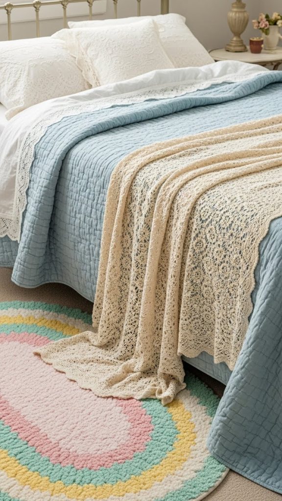 Layering textiles such as quilts, rugs, cushions, and curtains is a hallmark of vintage interior design. Opt for fabrics with subtle patterns—florals, stripes, or polka dots work beautifully. Mixing textures, such as lace, velvet, and crochet, can make the room feel warm, inviting, and luxurious. For bedding, a quilt or bedspread in muted tones combined with lace-trimmed pillows can instantly enhance the vintage aesthetic.