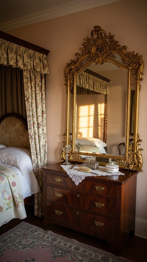 Mirrors with ornate frames or antique finishes can add elegance and the illusion of space. Gold, bronze, or whitewashed frames are particularly suitable for vintage interiors. Position mirrors strategically to reflect natural light and brighten the room. Additionally, small reflective accents like vintage trays, candle holders, or glass vases contribute subtle glamour to a vintage space.