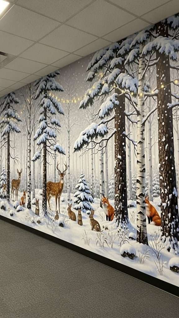 Cover one wall with a large mural featuring winter trees. Use white, gray, and blue tones, and decorate the trees with snow, woodland creatures, or student artwork. Add fairy lights for a magical winter night effect. This mural becomes a beautiful seasonal focal point and can enhance lessons about habitats or storytelling.