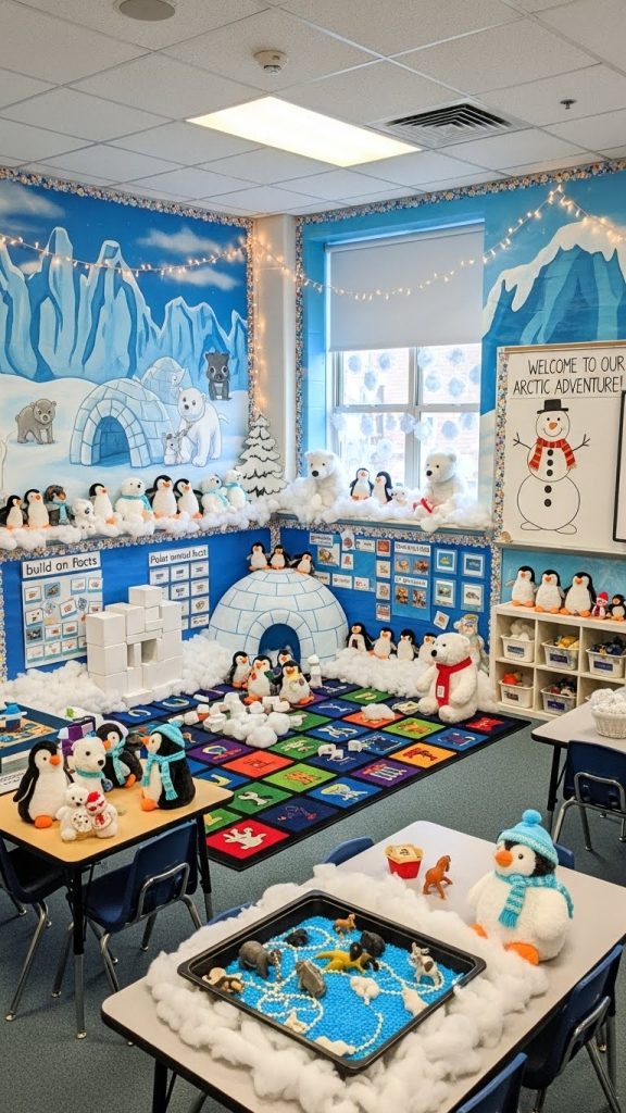 Decorate the classroom with penguins, polar bears, seals, snow owls, and Arctic foxes. Create icy blue backdrops, add white snow drifts made from cotton batting, and place animal cutouts around the room. Integrate learning by adding fun facts or student-created posters. This theme makes science lessons extra exciting!
