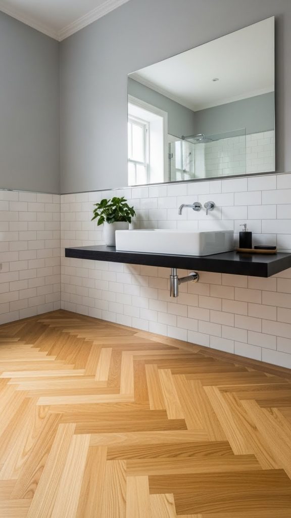 Wooden flooring in bathrooms creates a seamless, warm environment. Engineered wood or water-resistant options like teak or bamboo are perfect for humid spaces. Wooden floors complement stone tiles, marble, and even modern minimalistic designs. Consider a herringbone pattern or wide planks to add visual interest and sophistication.