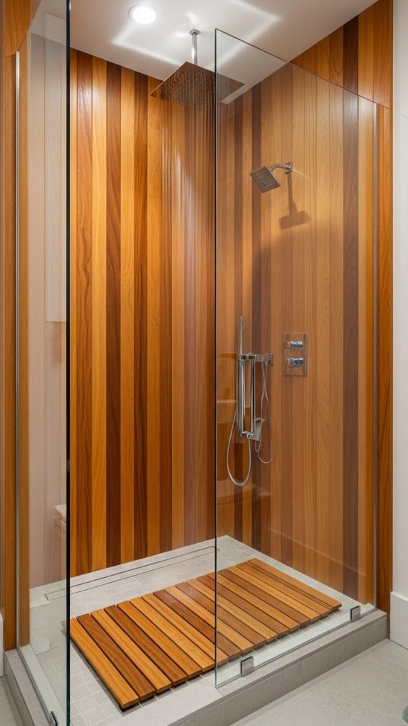 Wood in the shower area creates a natural, spa-like ambiance. Teak and cedar are ideal because they resist moisture and mildew. Wooden shower walls can be combined with glass panels for a modern touch or left as a full wood feature for a rustic retreat. This approach creates a unique sensory experience, connecting the warmth of wood with the refreshing feel of water.