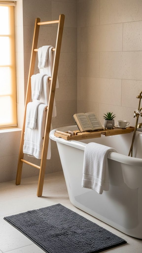 Wooden ladder racks for towels are both functional and stylish. They can lean against a wall or be mounted, offering a rustic or modern aesthetic depending on the finish. Wooden accessories such as stools, bath trays, or small side tables can complete the look, creating a cohesive design theme.